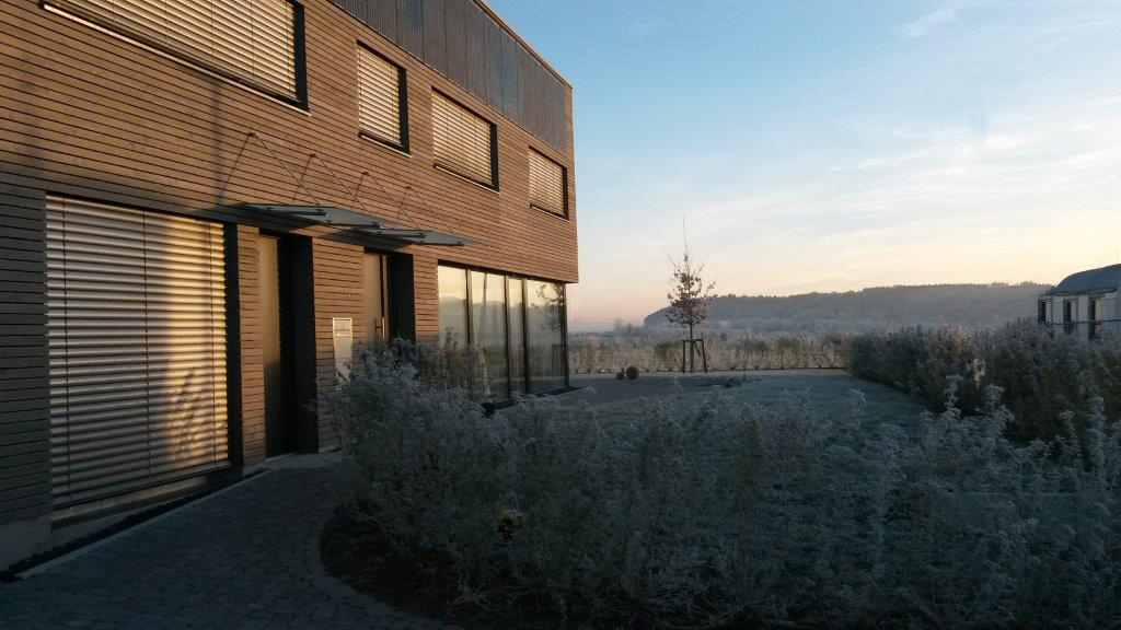 Während meiner Zeit von 2007 – 2014 bei Wamsler Architekten in Markdorf haben wir viele Passiv – und Plusenergiehäuser im süddeutschen Raum bis nach Tübingen geplant und gebaut. Eines davon, welches ich als Projektarchitekt entworfen und gebaut habe, ist das Passivhaus B. am Ortsrand von Herrenberg mit besonders schönen Blick auf den Schönbuch. Die geringe Heizenergie des Passivhaues in den zwei Wohneinheiten konnte mit einer Erdwärmepumpe mit Energiekörben im Außenbereich verwirklich t werden. Der Strom für die Wärmepumpe kommt zum überwiegenden Teil aus der hauseigenen Photovoltaik – Anlage. Ein Teil der PV Anlage ist auf dem Flachdach montiert und mit 8° nach Norden geneigt, der andere Teil ist in die Südseite der Fassade integriert, um die tiefstehende Sonne des Winters ein zu fangen und den Verlust der Fläche nach Norden auszugleichen. Der Baukörper des Gebäudes hat klare Kanten ohne Dachüberstand und ohne Vor- und Rücksprünge.